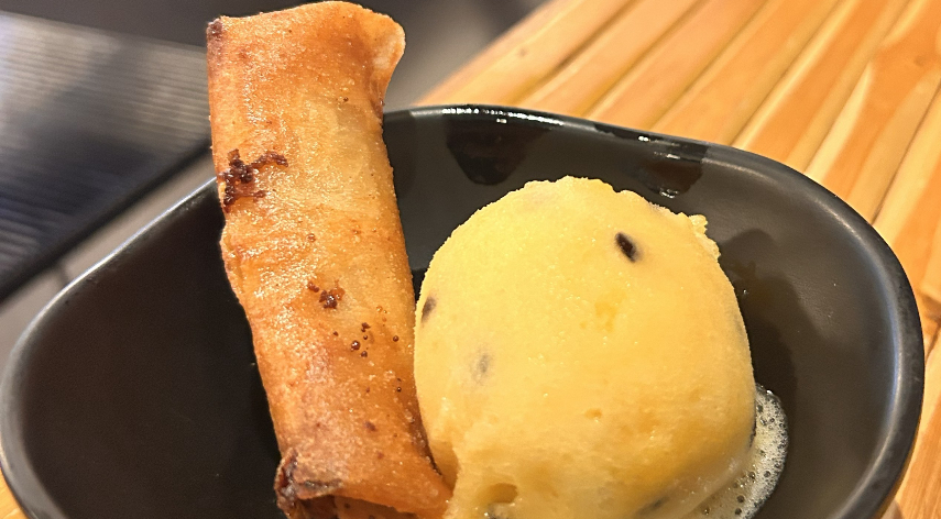 Ainda tivemos a audácia de pedir sobremesa: sorvete de maracujá e harumaki de doce de leite.