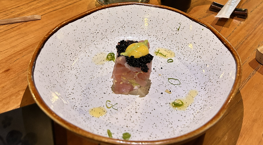 De entrada, experimentamos o tartar de atum, que vem marinado em molho shoyu e estava muito bom