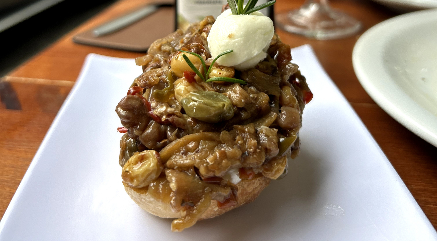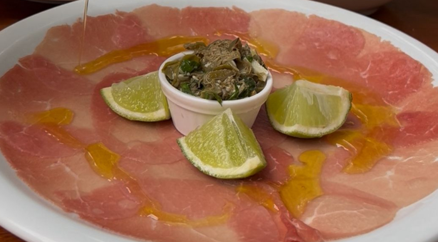 Lâminas de carne com molho de alcaparra e baguete de gergelim fatiado (R$29)