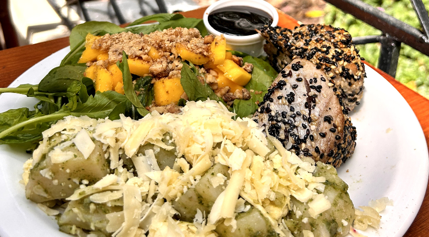 Lombo de atum com crosta de gergelim, salada de rúcula, manga e nozes caramelizadas e batata inglesa com pesto de coentro (R$56)