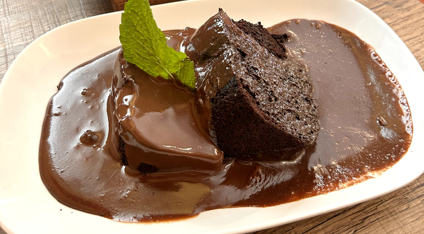 Duas fatias de bolo de chocolate servidas com calda quente e generosa de brigadeiro (R$ 25 )