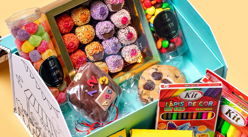 A Caixa Interativa de Pintura (R$ 325,00), preparada pela Louzieh Doces para o mês das crianças tem formato de uma casinha que pode ser pintada e personalizada. Ela vem acompanhada de lápis de cor, canetinhas, materiais de pintura e massinha de modelar.