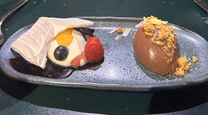 De sobremesa, suspiro com frutas vermelhas e ainda o cremoso de chocolate belga.